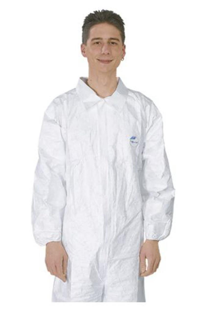Chemie-Schutzoverall Typ 5 und 6 aus weissem TYVEK-Spinnvlies, antistatisch, verdeckter Zweiwegreissverschluss, Gummizüge im Bund und an den Ärmel- und Beinabschlüssen.