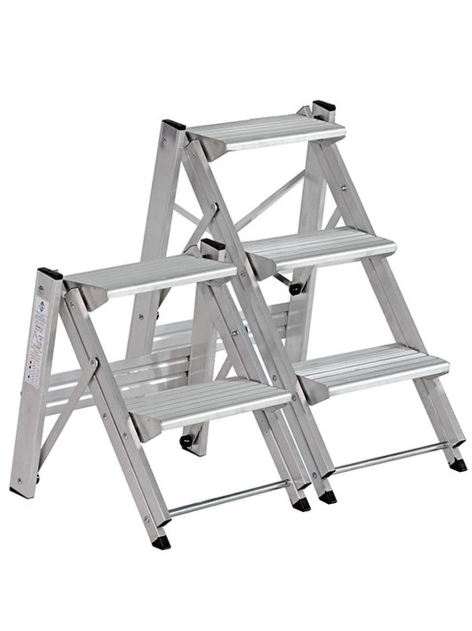 Professionelle Sicherheitstreppen aus Aluminium. Leicht und kompakt zusammenklappbar. Grosse Leichtmetall-Stufen 350x200 mm für sicheren und komfortablen Stand. Füsse mit rutschfesten Gummischuhen. Erfüllen die Europäische Sicherheitsnorm EN14183.