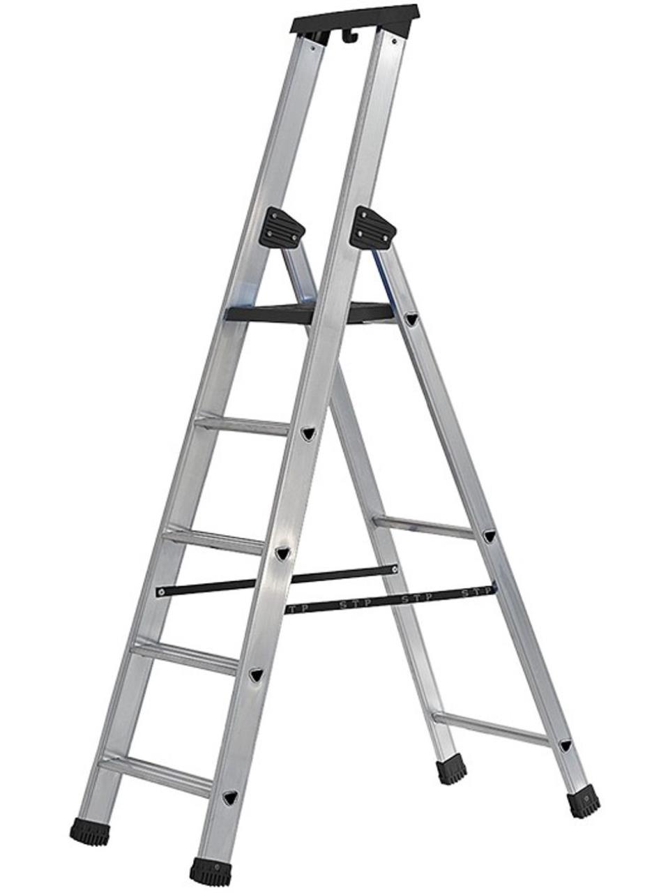 Industrielle Stehleiter auch für den Hausgebrauch geeignet. Stufen mit rutschfester Oberfläche, automatisch klappbare Plattform und Sicherheitsgeländer.