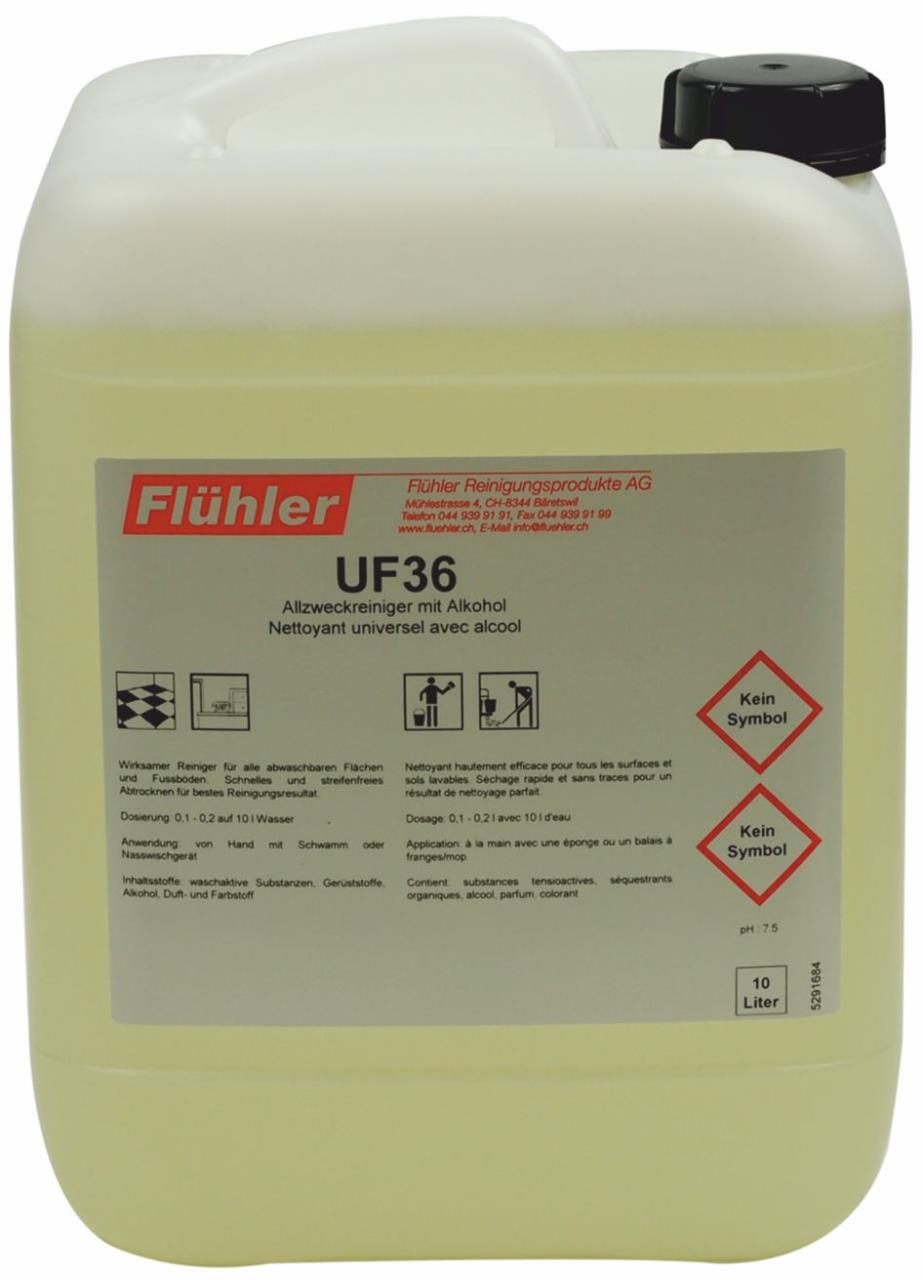 UF36 Allzweckreiniger mit Alkohol UF36 Universalreiniger mit AlkoholAllgemeiner KurzbeschriebUniversalreiniger mit Alkohol. Wirksamer Reiniger für alle abwaschbaren Flächen und Fussböden. Schnelles und streifenfreies Abtrocknen für bestes Reinigungsresultat.Geeignete OberflächenHochglanzböden, wasserbeständige OberflächenAnwendungVerdünnt im Eimer mit Reinigungstuch, Schwamm oder NasswischgerätDosierung100 – 200 ml auf 10 l Wasser (1% - 2%)SchaumverhaltenStark schäumendDuftDezent, grün und fruchtigpHKonzentrat: 8-9; Verdünnt: 7VOC-Anteil5% Inhalt / Grösse5 l 10 l 220 l 9 x 1 l 1 l Ihr Preis CHF 46.50 exkl. MWST Artikel-Nr.: 400040B Lieferzeit: Sofort lieferbar Produktname* Bitte das Feld Produktname ausfüllen. In den Warenkorb zur Merkliste hinzufügen Downloads Produktinformationen Sicherheitsdatenblatt 1 Diese Artikel könnten Sie ebenfalls interessieren Reinigungsmaterial Portionenflasche 500 ml (etikettiert) 100907 CHF 1.95 Reinigungsmaterial Zylinderflasche 1000 ml (etikettiert) 100919 CHF 2.20 Reinigungsmaterial Messbecher PP (1/4 lt) 100935 CHF 2.40 Reinigungsmaterial Trichter 12 cm 100931.1 CHF 6.05 Reinigungsmaterial Bidonschlüssel 5/10 lt 100988 CHF 1.00 Reinigungsmaterial Verschluss mit Ablasshahn für Bidon (10l / 5l) 100902.1 CHF 8.00 Reinigungsmaterial Pumpe für Kunststoff-Fass 220 lt 100994.1 CHF 95.00 Danke Herzlichen Dank für Ihre Kontaktaufnahme. Wir werden uns in Kürze mit Ihnen in Verbindung setzen. Schliessen Der Artikel wurde zur Merkliste hinzugefügt. Zur Merkliste