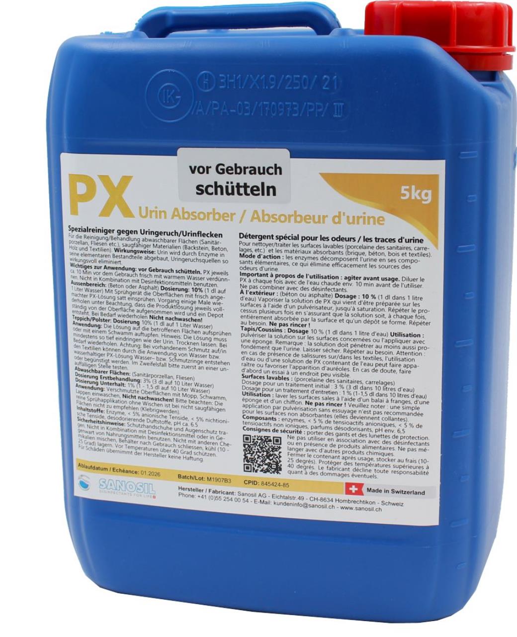 Sanosil PX est un nettoyant enzymatique et un désodorisant pour lutter durablement contre les odeurs d'urine et autres substances odorantes désagréables en dégradant les sources d'odeurs. Il convient au nettoyage d'entretien des surfaces lavables (toilettes très fréquentées, porcelaine sanitaire, murs carrelés, etc.) ou au traitement des matériaux absorbants tels que les murs en briques et en béton dans les passages, les souterrains / passages, etc.